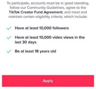 Conditions: Age above 18 years, 100 thousand views in the last thirty days, and 10 thousand followers. You have an account that complies with the TikTok Community Guidelines and Terms of Service.